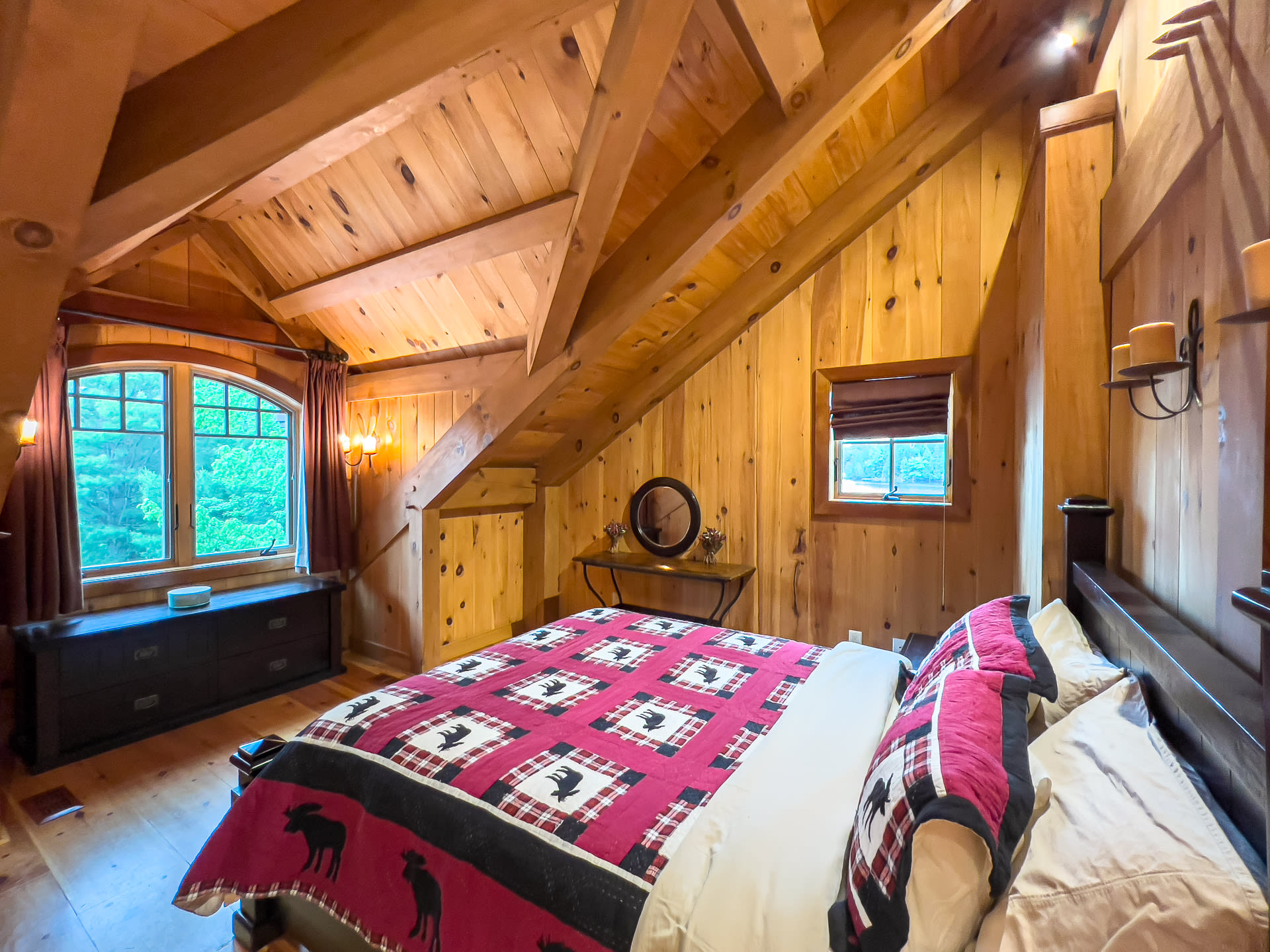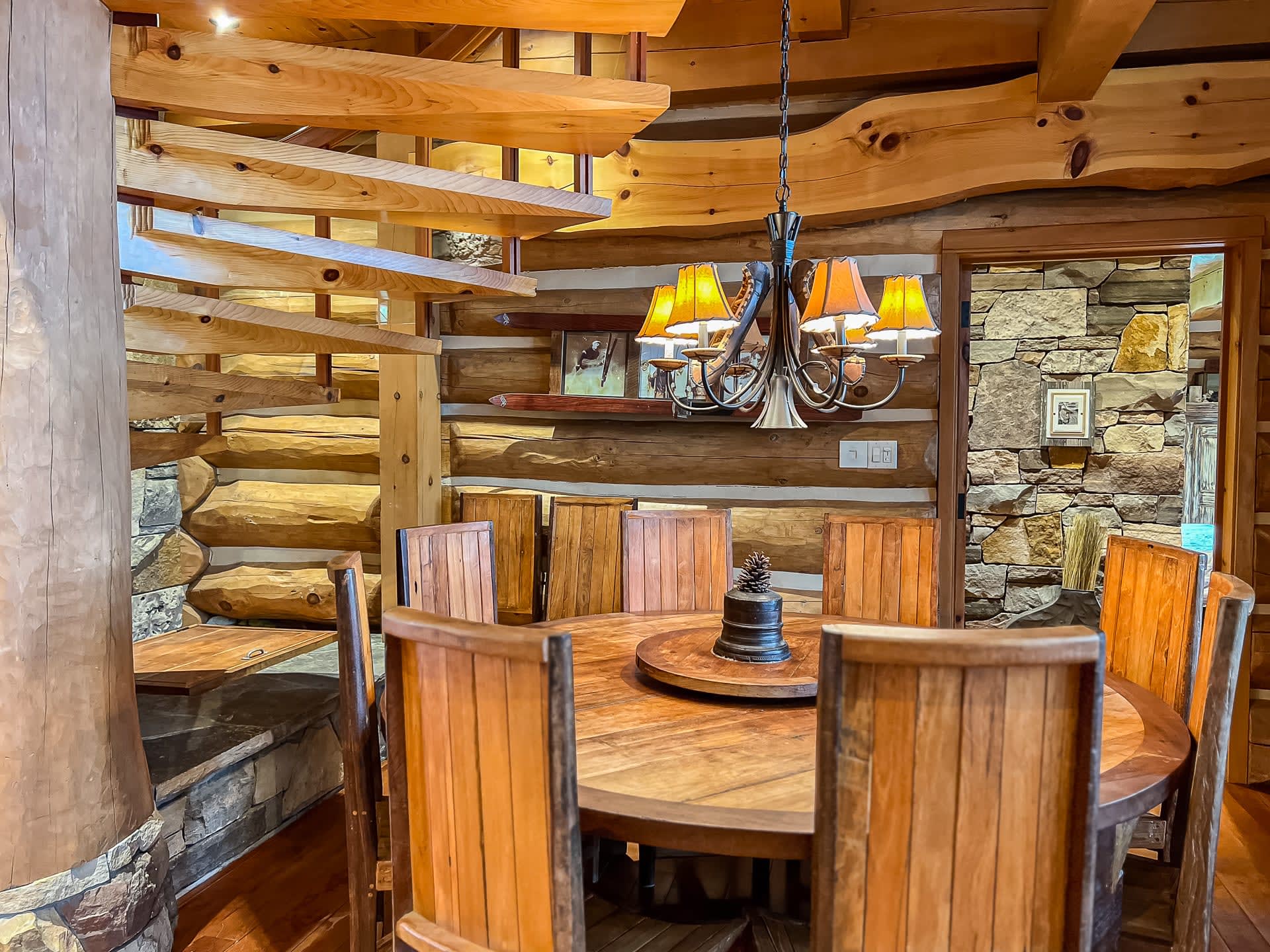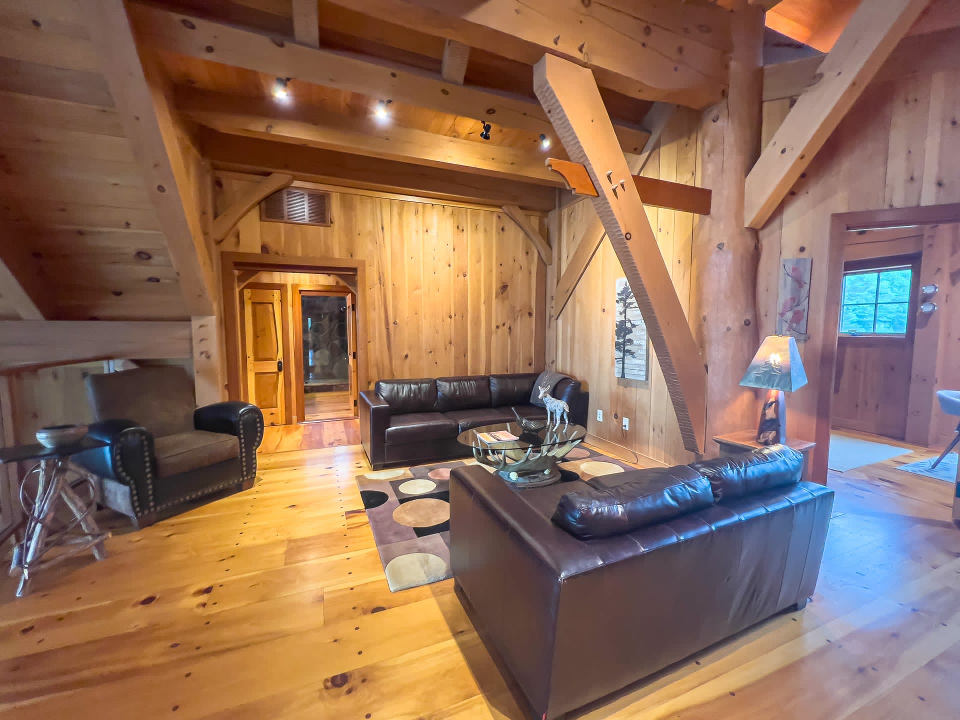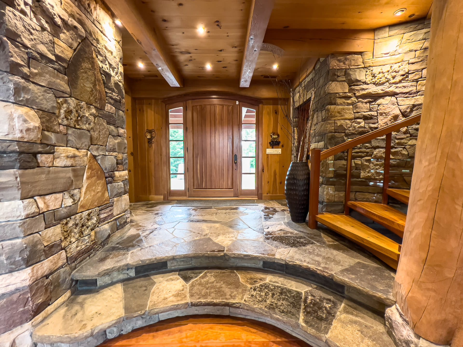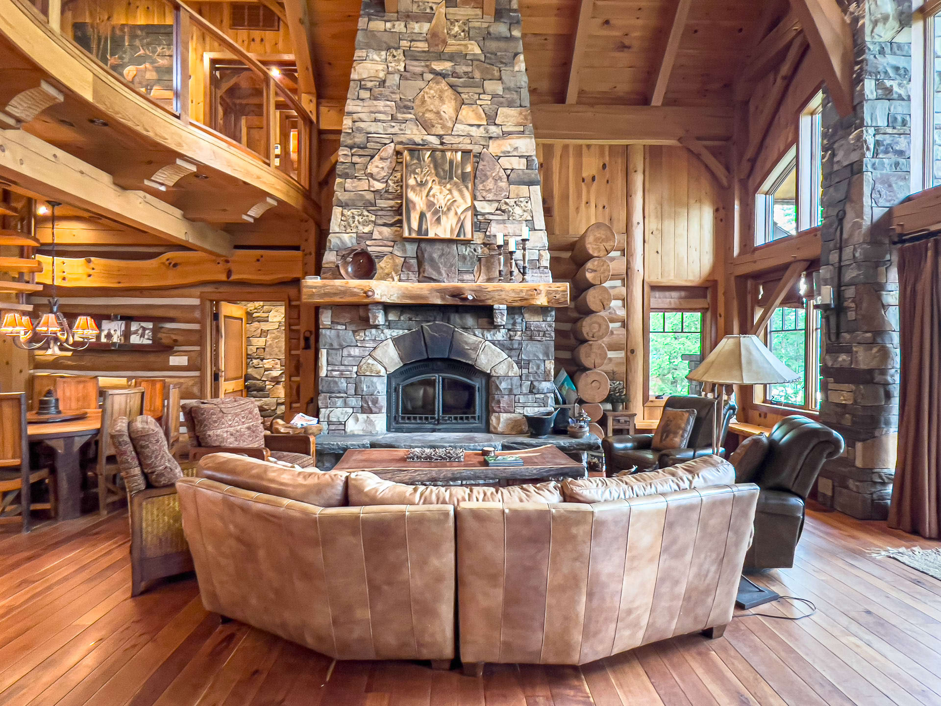 For discerning golf travelers and groups with refined tastes, this bespoke lakefront retreat, Timber Dream, stands unparalleled as your executive vacation home. Elevate your next Muskoka golf getaway at this extraordinary timber frame masterpiece, where stunning design features—like the curved stone floor, massive stone fireplace, and pine log radiating stairs—set the stage for unforgettable stays.